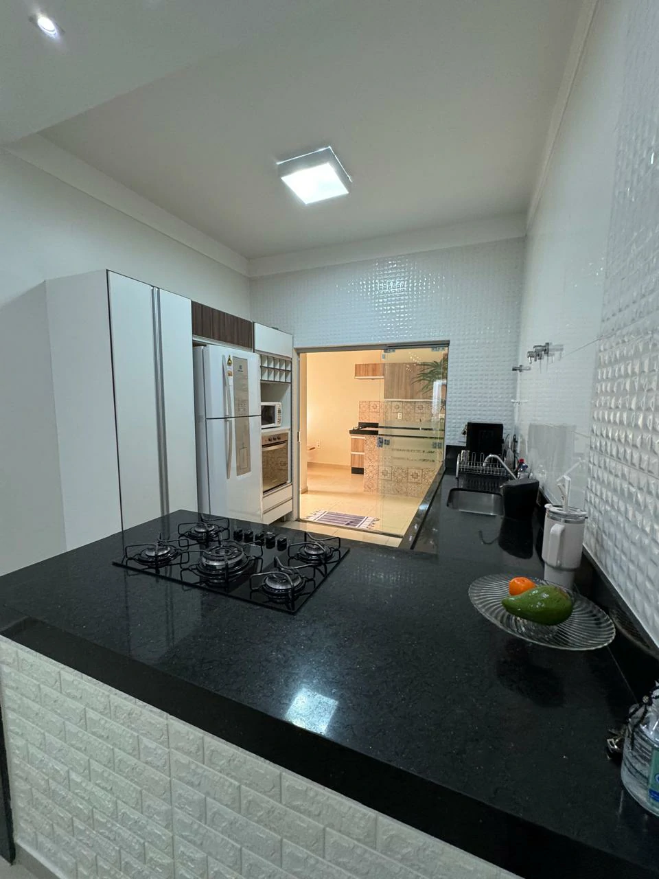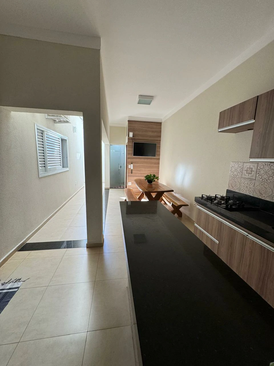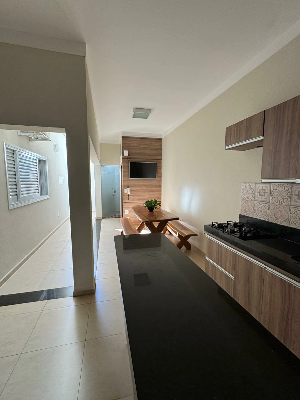 Sala, copa e cozinha integradas